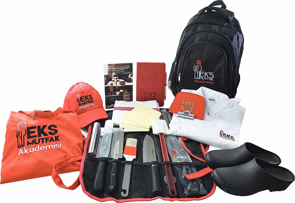 Pasta seti (8 parça), aşçı ceketi (1 adet), şapka (1 adet), önlük (2 adet), EKS notebook ve EKS sırt çantası