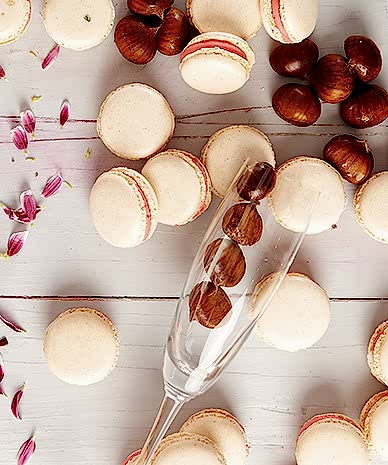 İç kreması için, bir tencerede kremayı kaynatın. Kaynattığınız kremayı ocaktan alıp fildişi çikolatayı ve tereyağını içine ekleyip karıştırın. Karışımı buzdolabında 1-2 saat bekletin. Dolaptan çıkarttığınız karışımın içine pembe jel gıda boyasını ekleyin. Mikserle çırpıp sıkma torbasına doldurun. Pişirdiğiniz macaron’ların yarısının üzerine kremayı sıkın. Kestane şekerini elinizle ufalayarak küçük parçalara bölün. Ufalanmış kestane şekerlerini kremaların üzerine serpin. Kalan macaron’lar ile kremalı macaron’ların üzerini kapatın. Afiyetle yiyin!