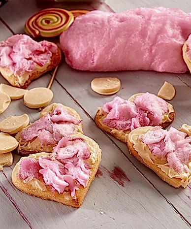 Tereyağı, pudra şekeri, yumurta akı, tuz ve vanilyayı bir kapta karıştırın. Unu yavaş yavaş ekleyip çok sert olmayan bir hamur elde edin. Tezgaha un serpip merdane yardımıyla hamuru açın ve kurabiye kalıpları ile kesin. Kurabiyeleri yağlı kağıt koyduğunuz fırın tepsisine yerleştirin. 180 derecede 8-10 dakika pişirin. Pişen kurabiyeleri tel ızgara üzerine alın ve soğuması için bekletin. Beyaz çikolatayı benmari usulü eritin. Soğumuş kurabiyeleri erittiğiniz çikolataya batırın. Pamuk şeker ile süsleyip servis edin.