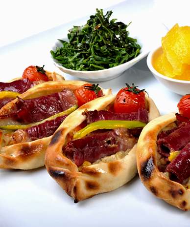 Un, su ve mayayı karıştırın. Maya gelişinceye kadar bekleyin ve bol unla tezgaha ve merdaneye yapışmayacak şekilde 12-15 cm çapında daireler açın. Bu sırada patlıcanları ateşin üzerinde (bu evdeki elektirikli veya gazlı ocak olabilir) közleyin, soyun ve kuşbaşı doğrayın. Közlenmiş patlıcanları soğutulmuş bir halde hamura yayın , üzerine dolmalık biberi çekirdeklerini çıkardıktan sonra jülyen doğrayın ve bir iki dilim patlıcanın üzerine koyun. İkişer dilim pastırmanın çemenlerini sıyırın sonra rulo yapıp biberiyle yan yana gelecek şekilde patlıcanın üzerine koyun. Kiraz domatesleri de yıkadıktan sonra pastırma ve biberden kalan üst kısma gelecek şekilde yerleştirin. Bu malzemeleri yerleştirdikten sonra hamurun iki ucunu büküp yapıştırarak pidedeki gibi kayık şekli verip tepsiye yerleştirin. Bu sırada rokayı yıkayıp kurulayın. Sonra keskin bir bıçakla ezmeden ince ince kıyın. Kıydıktan sonra yine doğranmış kırmızı soğanları kıyıp rokaya ekleyin, sızma zeytinyağı ve nar ekşisini de ekleyip tuz ve biberle lezzetlendirin. Greyfurdu elinize alıp en üst ve en altında iç kısmı gözükecek şekilde kabuğundan halka şeklinde kesin. Daha sonra bıçak yardımıyla soyarak sırt kısımlarını zarsız kalmasını sağlayın ve sırt kısımlarından greyfurdun dilimlerinin kabuksuz bir şekilde çıkmasını sağlayın. Servis ederken mini lahmacunları bir araya dizin yanında ise küçük sos kaplarında salata ve greyfurt dilimlerini sunun.